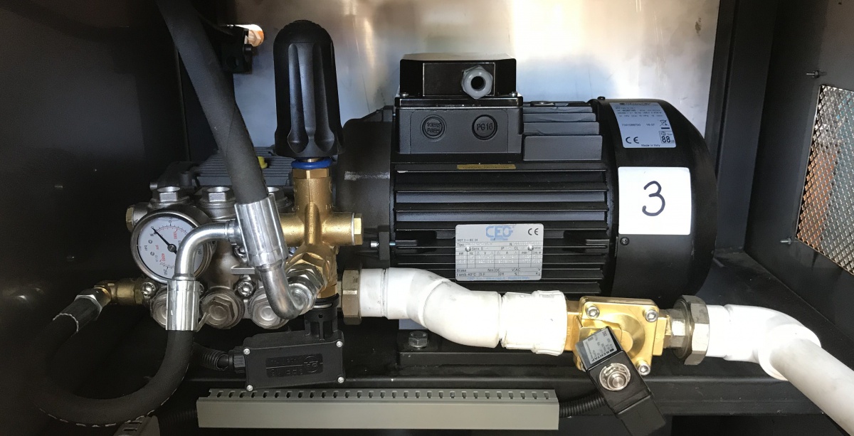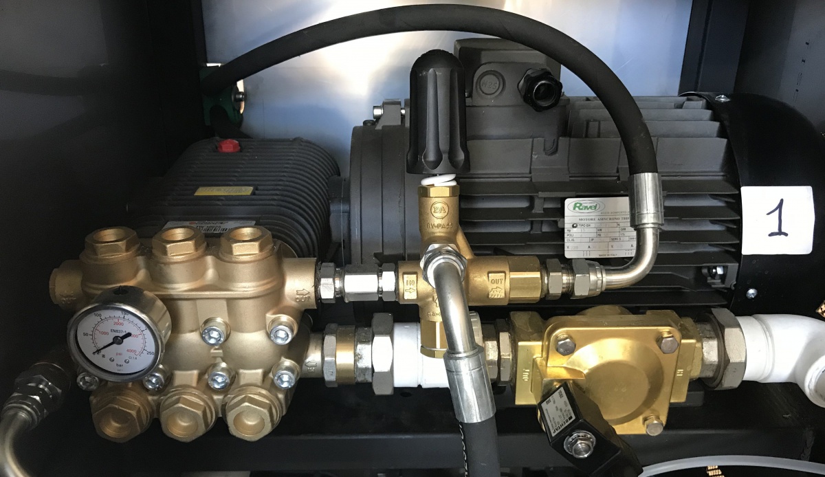 Трехплужерные насосы высокого давления специальное исполнение для горячей воды. Профессиональный регулятор давления система перепуска BY-PAS. Группа насосов высокого давления закрыта от группы дозирования химии панелями из нерж.. Моечные головки на постах работают не зависимо.