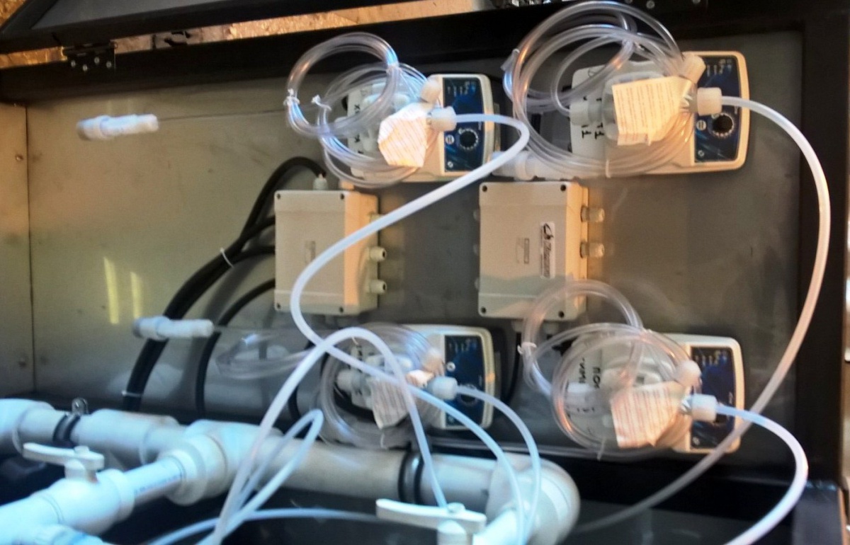 4 мембранных соленоидных дозирующих насоса моющих средств 30 л/ч ( кислотных или щелочных) на входе установлен термодатчик, показывающий температуру воды и отключающий установку при превышение 85 С, установлен датчик потока отключающий установку при нехватке воды. Все отображается на панели оператора и сохраняется в памяти.+ насос для мойки люков и патрубков 5,6 кВт