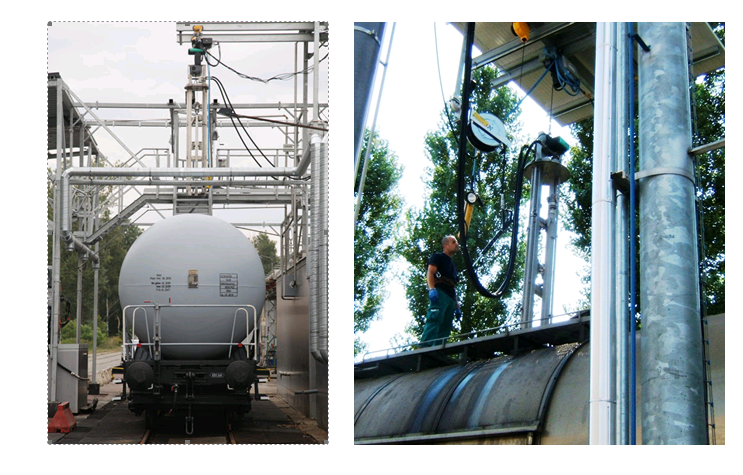 В состоянии покоя рычаги закрыты, а головки прижаты к опорным конструкциям системы, что позволяет установить их внутри железнодорожной цистерны, проведя через люк.